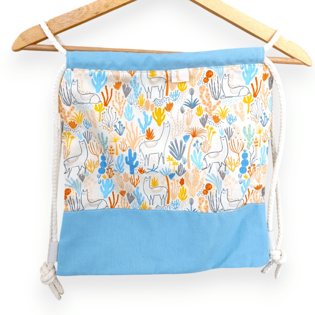 Las asas son cuerdas gordita para una mayor comodidad del peque. Se cierra estirando de cada lado de la cinta y se queda formando un saquito que se puede colgar en el brazo.