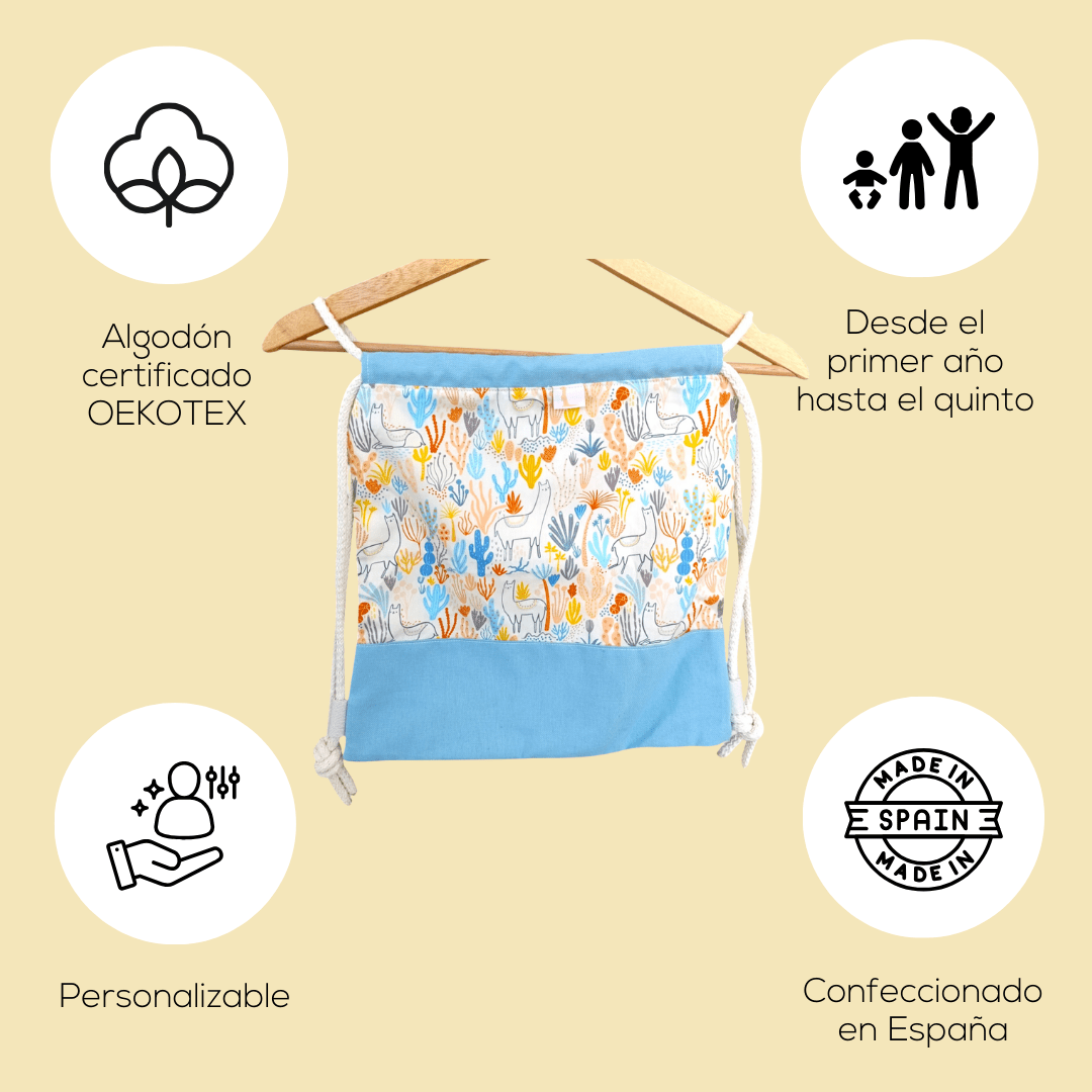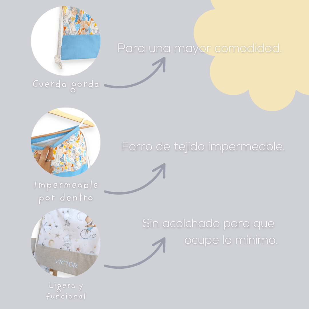 Están elaborada en tela de algodón OEKO TEX estampado en el exterior. El interior es de tela impermeable, ya sabes lo fácil que es que una botella se derrame, fugas de pañal, ropa mojada… y así hasta el infinito, por eso que el interior sea impermeable es un puntazo, verdad?