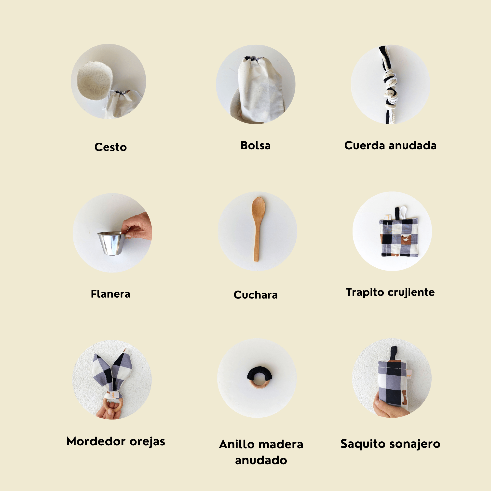 Cesta de los tesoros montessori ideal para hacer un regalo a un bebe de entre 4 meses y 18 meses. Este tipo de juego se llama juego heurístico y ofrece a los niños la oportunidad de investigar el mundo a partir de sus acciones, favoreciendo su aprendizaje gracias a sus propios descubrimientos.