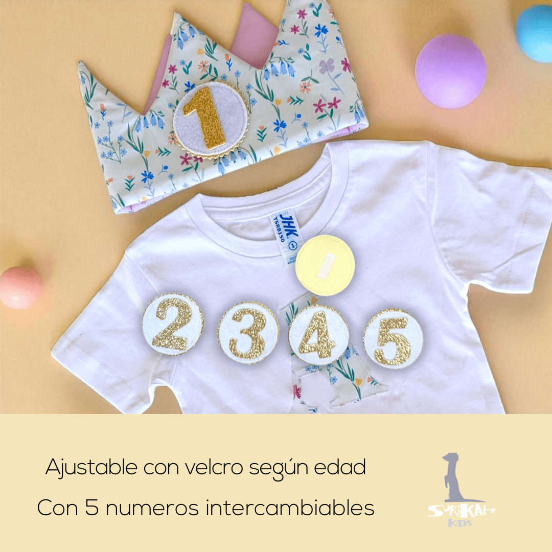 La corona está elaborada en tejido 100% algodón y guata en el interior. Es reversible y viene con números de 1 al 5.