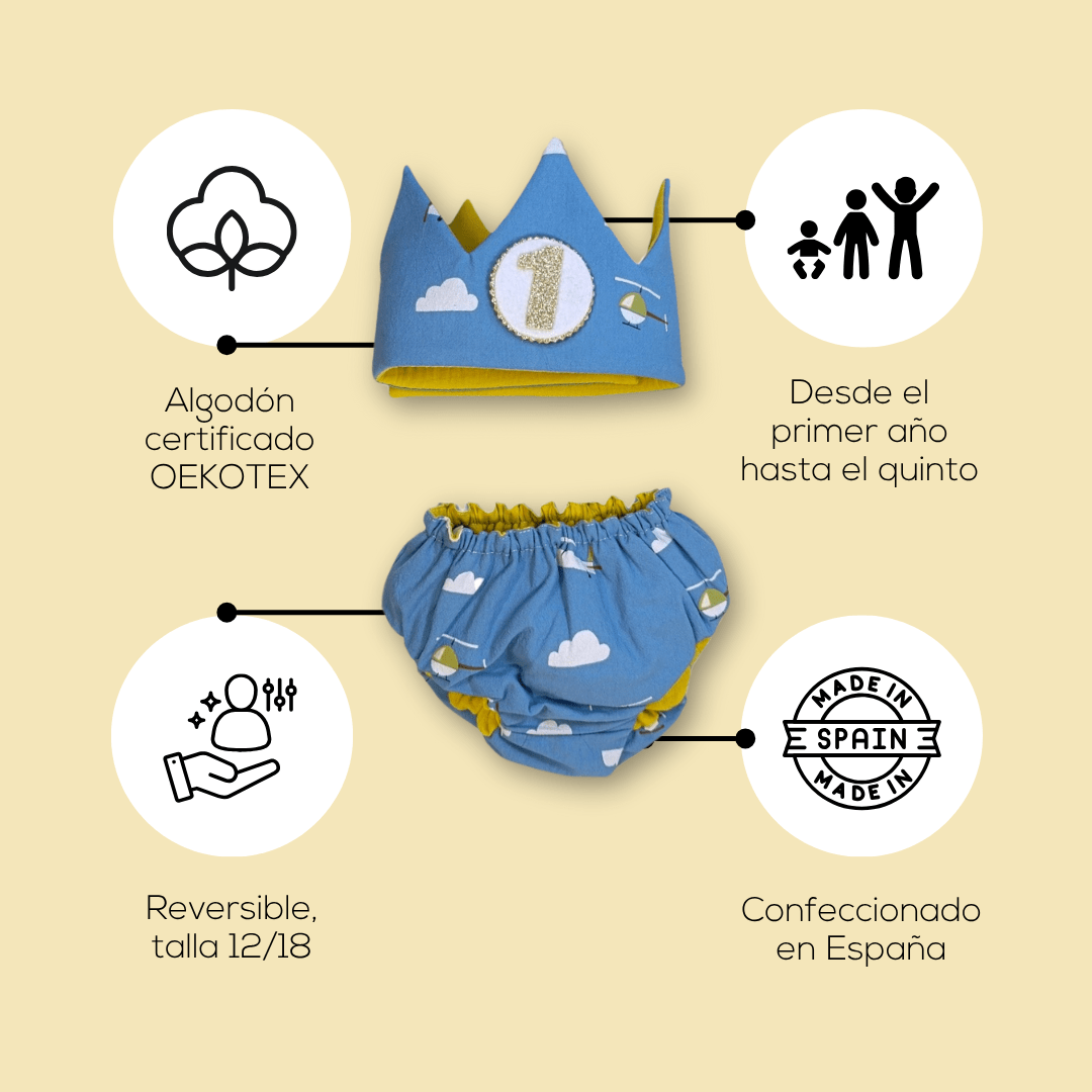 El conjunto está compuesto por una corona y un cubrepañal de la talla 12-18, ambos reversibles.